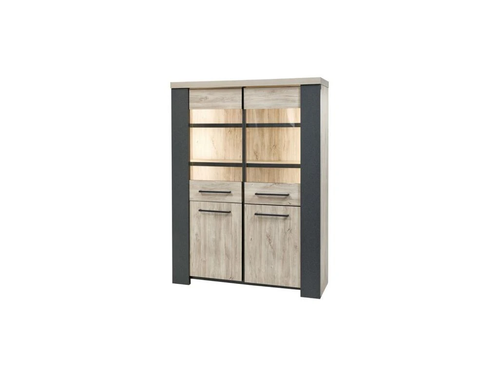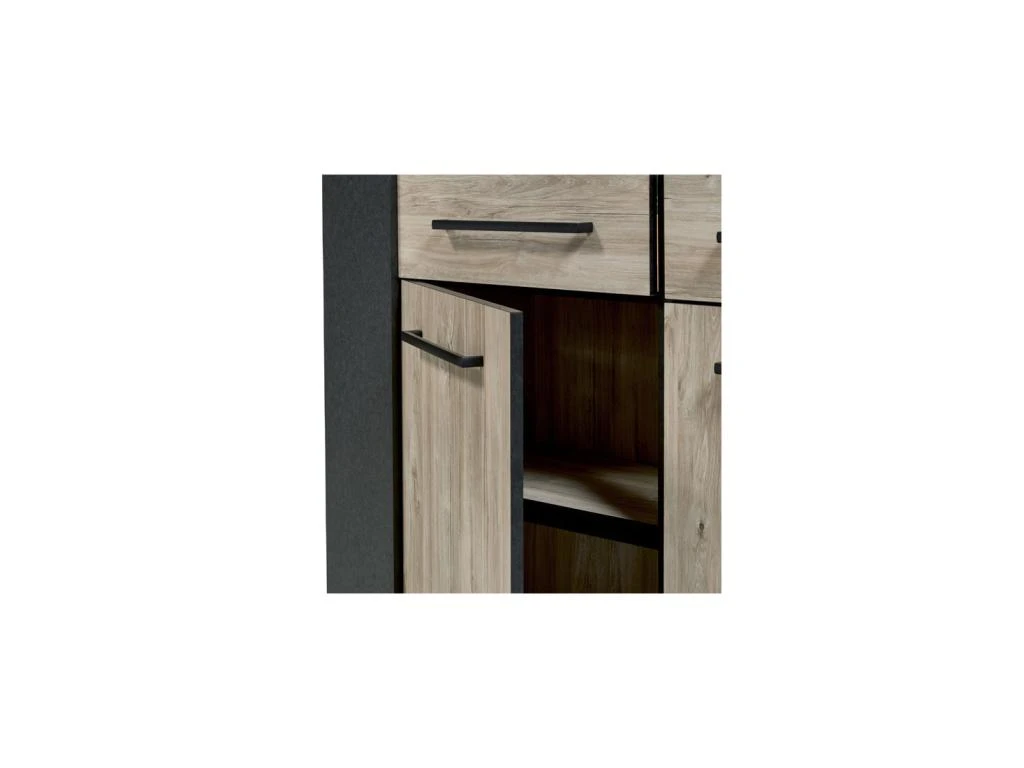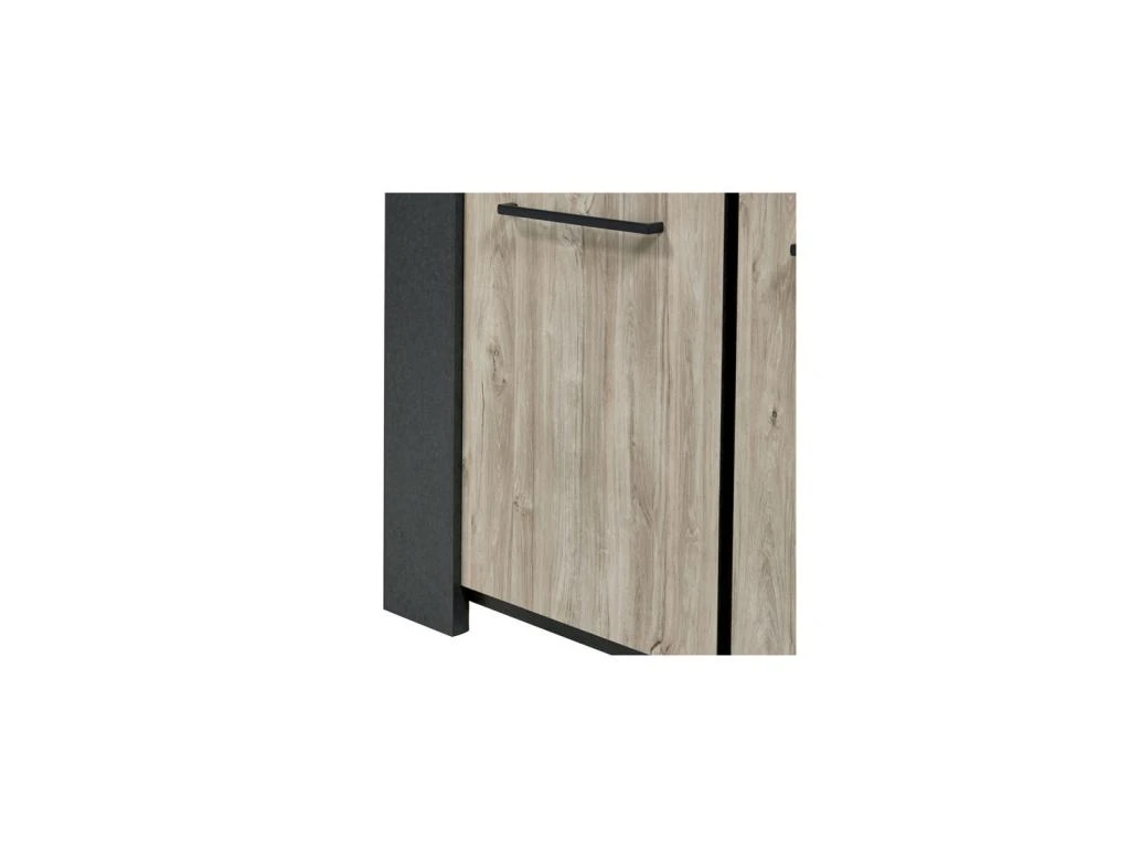 L’association d’une finition Chêne délavé mettant en avant un veinage au rendu plus vrai que nature et d’un revêtement façon métal patiné très probant offre à cette armoire de salon une signature visuelle toute particulière qui lui assure de pouvoir prendre place dans un environnement contemporain ou même au sein d’un ameublement plus classique.