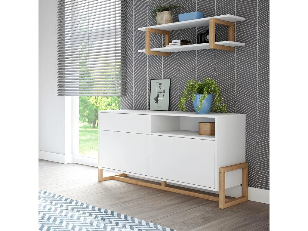 ApprĂ©ciez le style rĂ©solument contemporain de ce buffet 1 tiroir 2 portes Oslo coloris blanc. Son piètement en bois de hĂŞtre apporte toute l’originalitĂ© de ce meuble aux lignes Ă©purĂ©es. Les façades ne disposent pas de poignĂ©e, les ouvertures des portes se font par un système de « pousser pour ouvrir ». Pas de rayon intĂ©rieur. A monter soi mĂŞme. Dimensions : L. 119,2 x l. 42 x H. 64,7 cm. Hauteur du piètement : 12 cm. Marque : Vivaldi Meble. Matière : MĂ©laminĂ© 16 mm et pieds en bois de hĂŞtre. Poids : 34 kg.Â