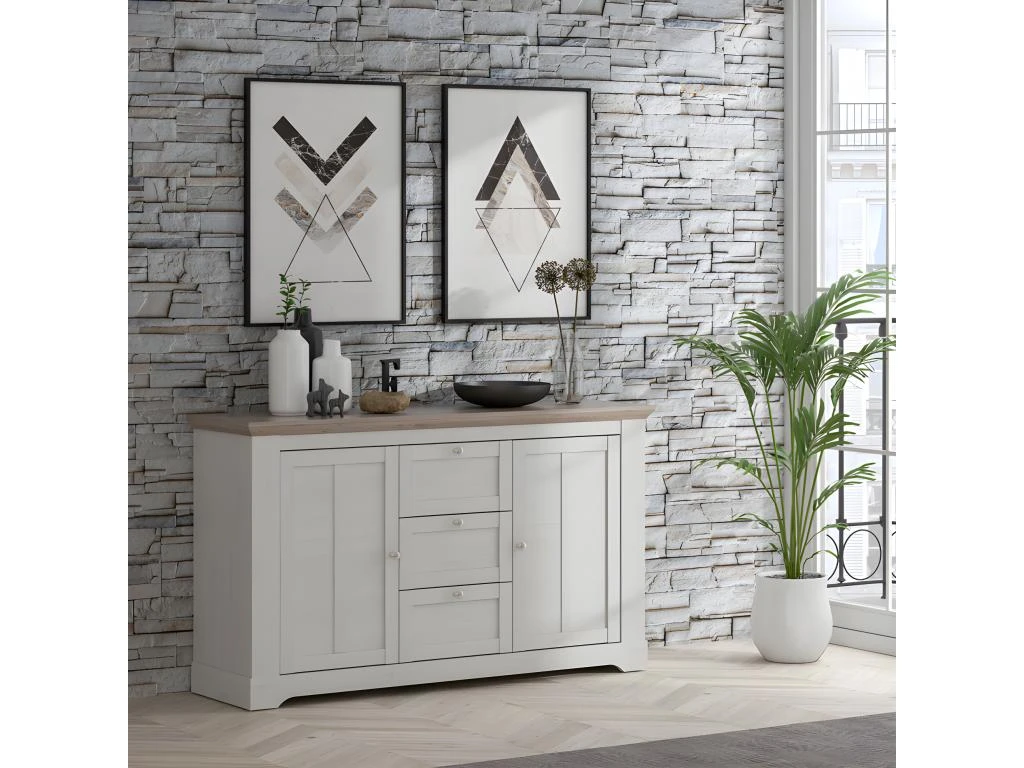 Un élégant buffet au style classique chic qui ajoutera une jolie touche campagnarde à votre intérieur. Dans votre salon ou votre salle à manger, le bahut ANGELE au décor chêne blanchi vous apportera un bel espace de rangement. Ses 2 portes et 3 tiroirs sont équipés du système « soft close » qui vous assure une fermeture en douceur. On aime son plateau marron aux bords biseautés qui apportent de la finesse et du raffinement à l’ensemble. Ses jolis boutons de porte en métal gris ajoutent de l’élégance au bahut. N’hésitez pas à l’associer à d’autres meubles ANGELE, une collection à l’inspiration classique et campagnarde.