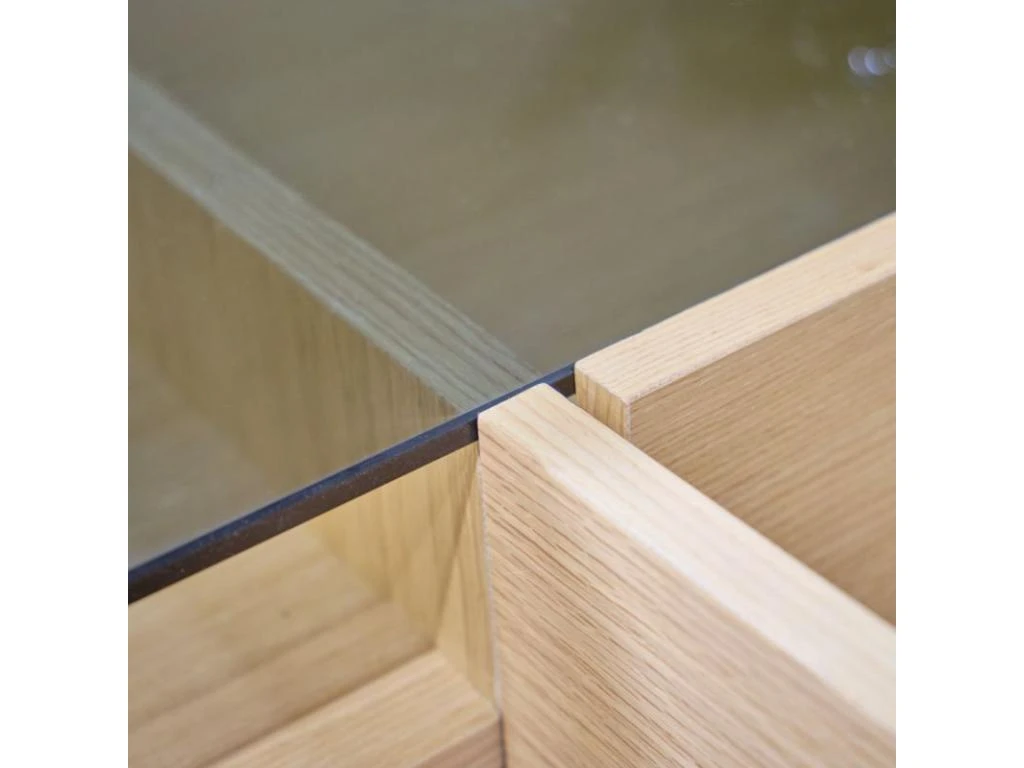 - COMPOSITION : Panneaux de particules, finition chêne clair. Plateau en verre fumé.