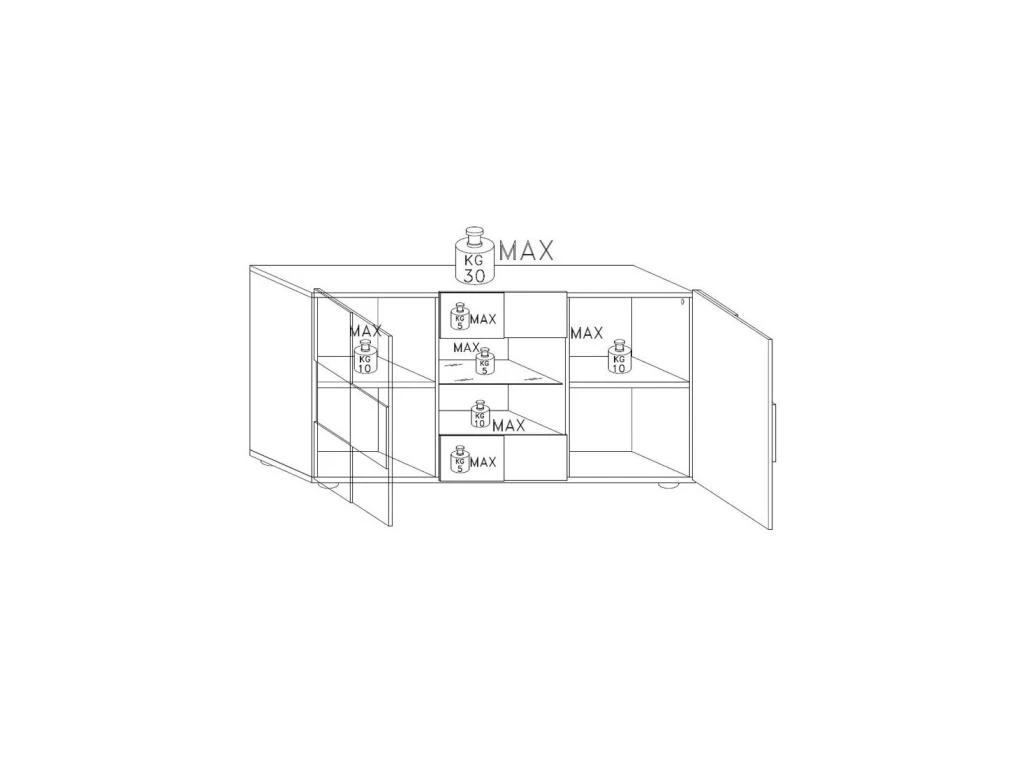 Les épaisses portes sont montées sur des charnières sur-dimensionnées pour un fonctionnement fiable et fluide. L’ouverture de ces portes libère 2 volumes de rangement équipés de 2 surfaces de pose qui permettront de ranger vaisselle, verres et linge de maison.