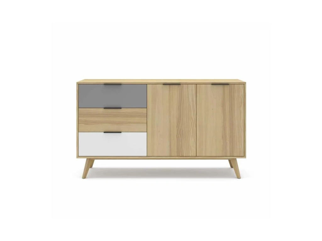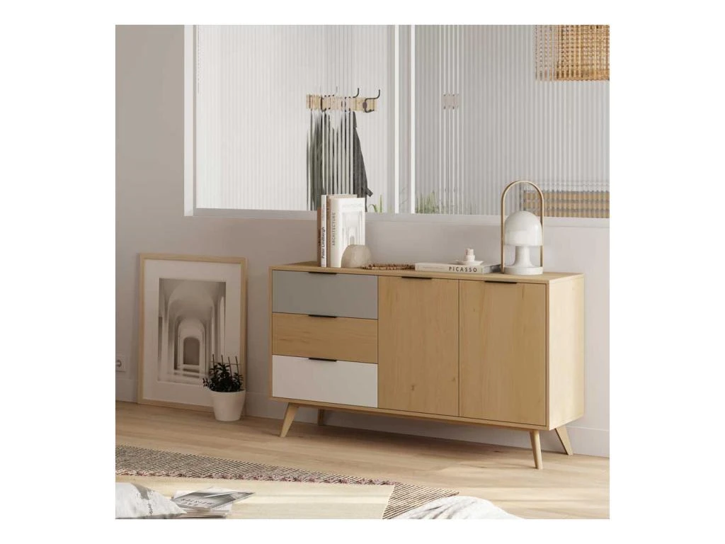 Apportez chaleur et modernitĂ© dans votre salle Ă manger avec ce buffet 2 portes 3 tiroirs mettant Ă l’honneur tous les codes du design Scandinave.