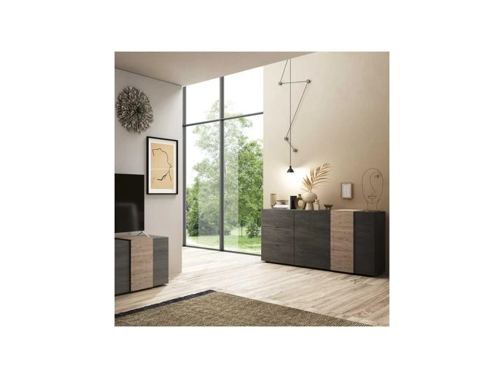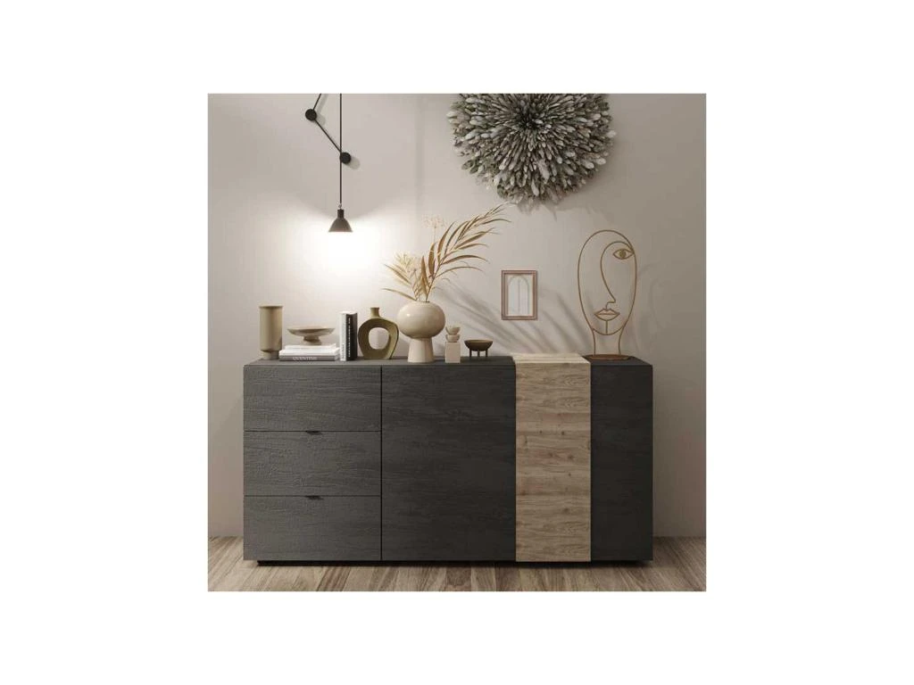 Mariant une finition bois Gris et des empiècements finition Chêne naturel au veinage plus vrai que nature, cette enfilade à la proportion parfaite permet de moderniser sagement votre coin repas.