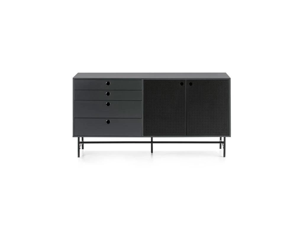 Le design avant-gardiste est nuancé par une lointaine inspiration du style mobilier Industriel (portes ajourées) assurant un look fédérateur et un mariage aisé avec des meubles de styles bien différents.