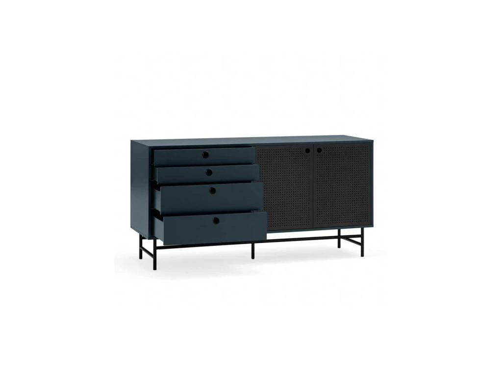 Mariage d’une laque bleu pétrole appliquée sur le corps du meuble et d’un piétement en métal laqué noir et assorti aux portes en métal.