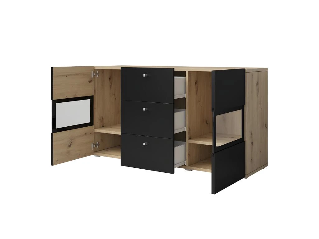 Offrez à votre salon un style unique au top des dernières tendances déco grâce à ce buffet de la gamme RAMOS ! Ce buffet est composé de nombreux rangements à savoir : trois tiroirs et trois portes avec une partie vitrée. Ces vitres vous permettront de mettre en valeur vos objets déco.