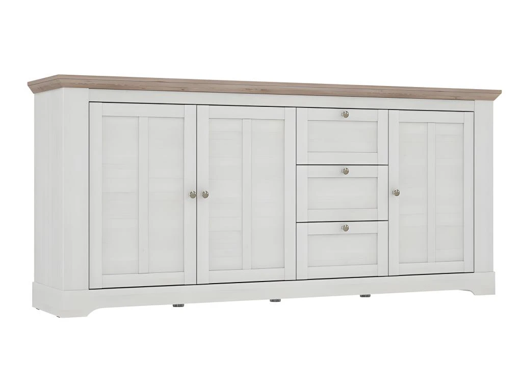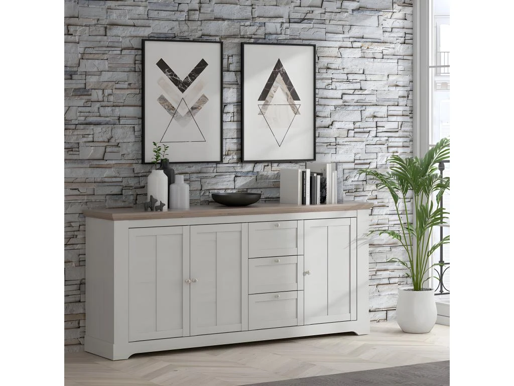 Un élégant buffet au style classique chic qui ajoutera une jolie touche campagnarde à votre intérieur. Dans votre salon ou votre salle à manger, le bahut ANGELE au décor chêne blanchi vous apportera un bel espace de rangement. Ses 3 portes et 3 tiroirs sont équipés du système « soft close » qui vous assure une fermeture en douceur. On aime son plateau marron aux bords biseautés qui apportent de la finesse et du raffinement à l’ensemble. Ses jolis boutons de porte en métal gris ajoutent de l’élégance au bahut. N’hésitez pas à l’associer à d’autres meubles ANGELE, une collection à l’inspiration classique et campagnarde.