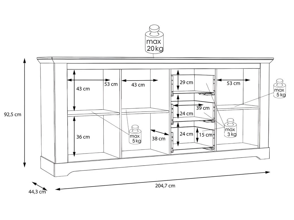 - POIDS max supporté : Plateau supérieur : 20 kg / Tablettes amovibles : 5 kg / Tiroirs : 3 kg.