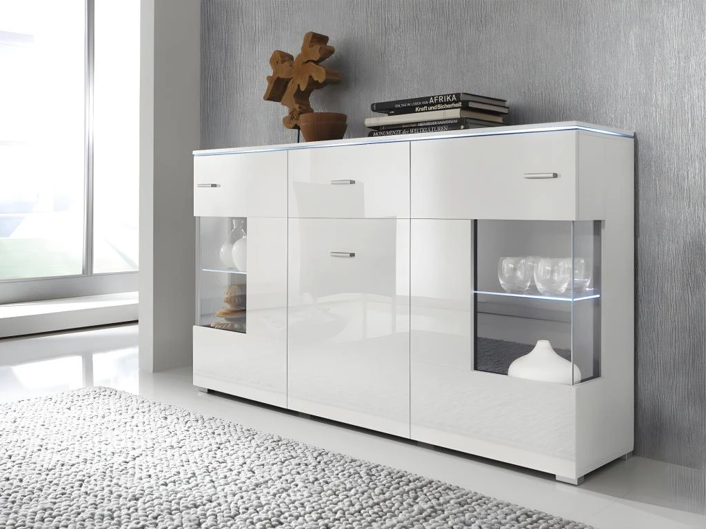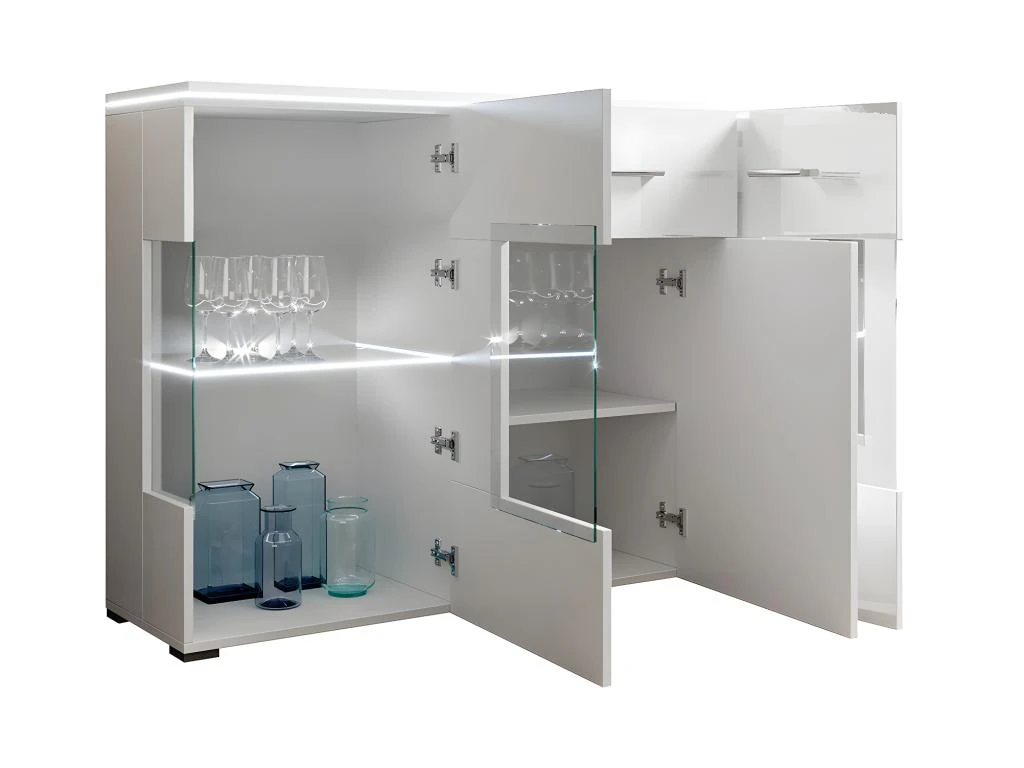 Caractéristiques: 3 portes – 1 tiroir avec glissière à billes – 3 étagères dont 2 en verre – LED – Inclus – Lumière RGB (rouge, vert, bleu, blanc) – LED à brancher sur prise secteur – Télécommande avec fonctions allumer / éteindre et lumière fixe, dégradé ou clignotante