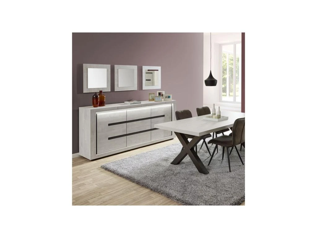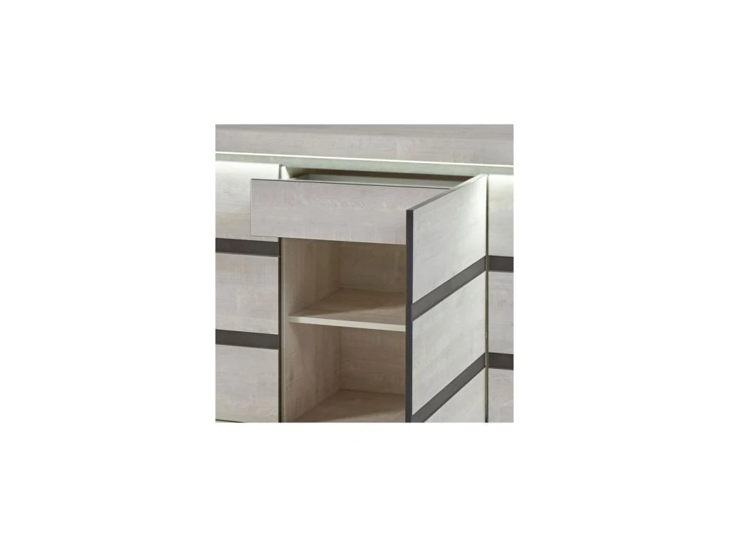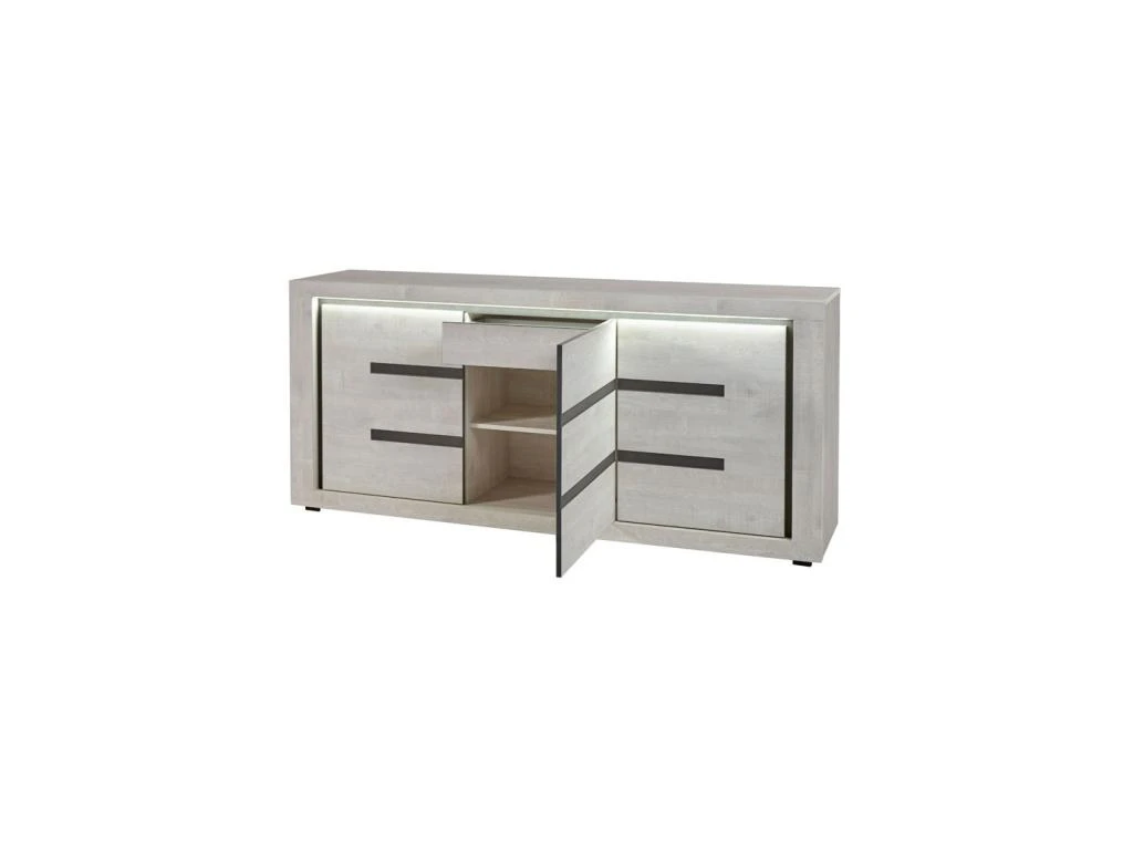 Le design moderne de ce buffet 3 portes met en valeur le revêtement Chêne teinte Craie et les détails contrastés qui rythment sa façade originale.