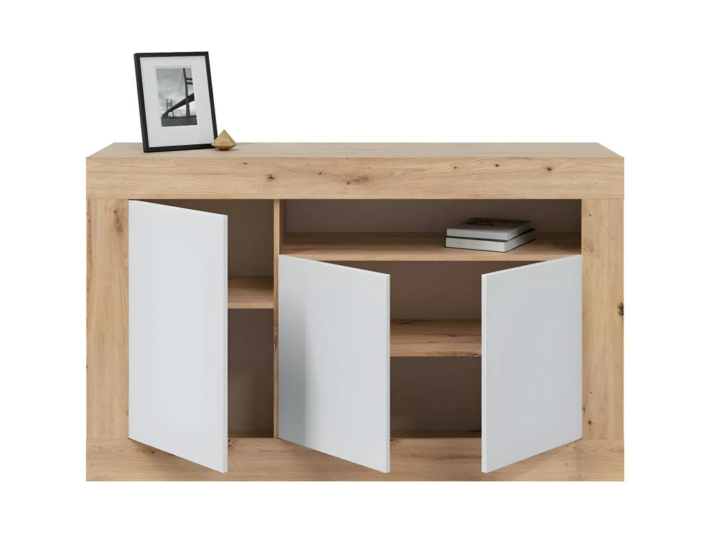 Apporter du rangement à votre intérieur grâce à ce buffet 3 portes avec 1 compartiment de rangement ! Son décor chêne nodi et blanc artique s’adaptera facilement à votre intérieur. Vous pourrez y ranger toutes les affaires de votre choix afin d’organiser votre espace.