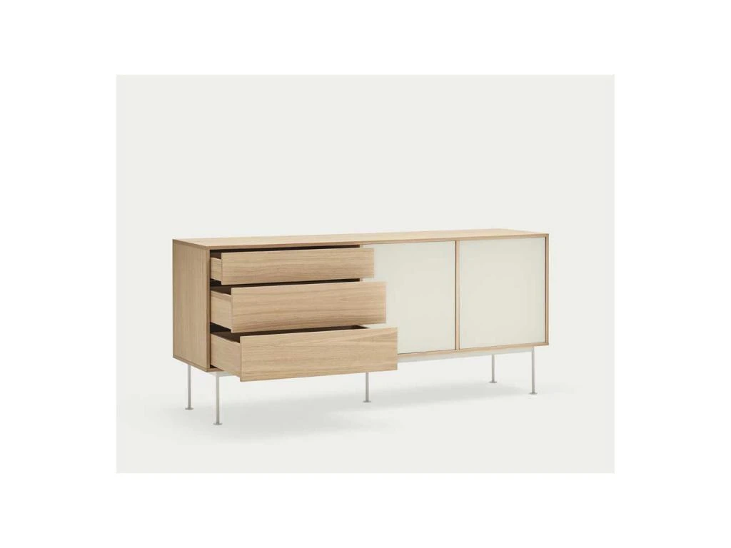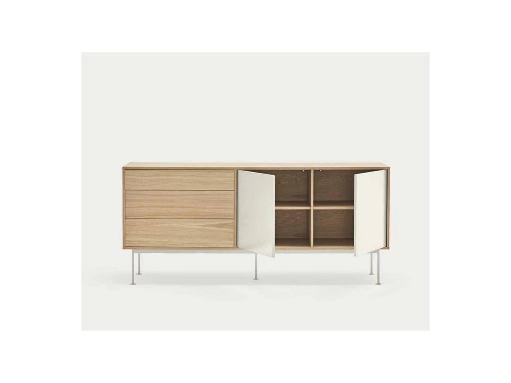 Reposant sur un piétement en métal laqué, cette enfilade à la proportion parfaite bénéficie d’une signature visuelle exclusive faite de légèreté combinée à une inspiration des meubles Scandinaves.