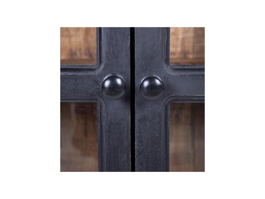 Campé sur des roulettes fonctionnelles, le corps de cette enfilade met en oeuvre du bois de Manguier associé à des ouvrants réalisés en métal laqué noir et pourvus de panneaux en verre.