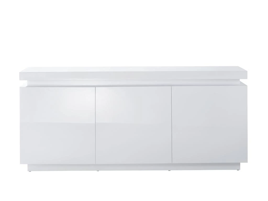Buffet ODYSSEE avec LED bleue – Structure en MDF – Finition laqué blanc brillant – Style et design contemporain – Équipé de 3 portes avec étagères – Grande capacité de rangement – Dimensions : L170 x P40 x H75 cm.