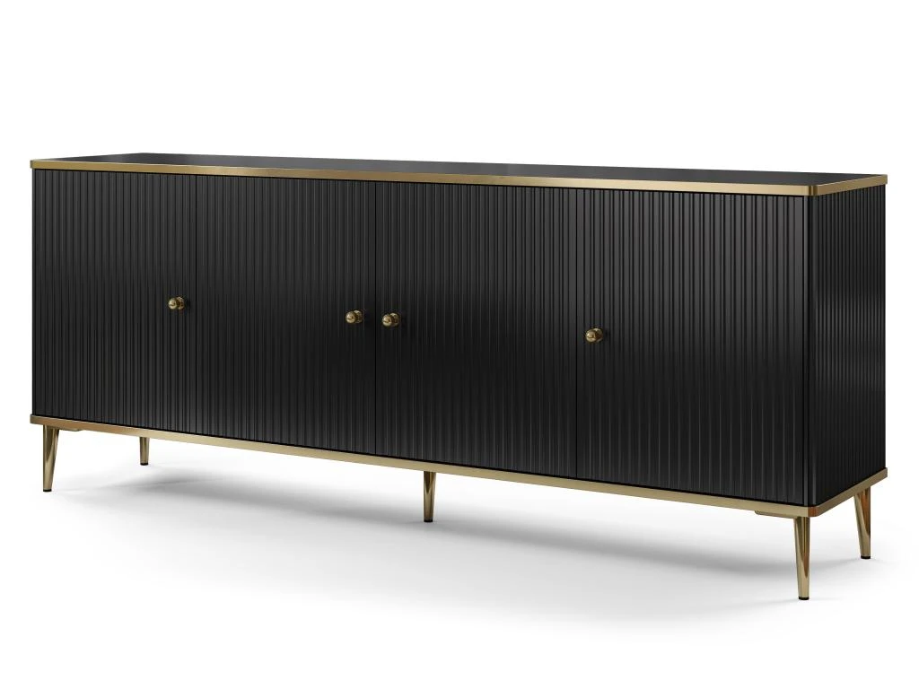 Le buffet SINEAD est le meuble idéal pour créer une ambiance sobre et distinguée dans votre séjour. Sa façade tout en relief et ses pieds et contours dorés sont gage de raffinement. Grâce à ses 4 portes et ses rangements intérieurs, vous organiserez facilement votre pièce.