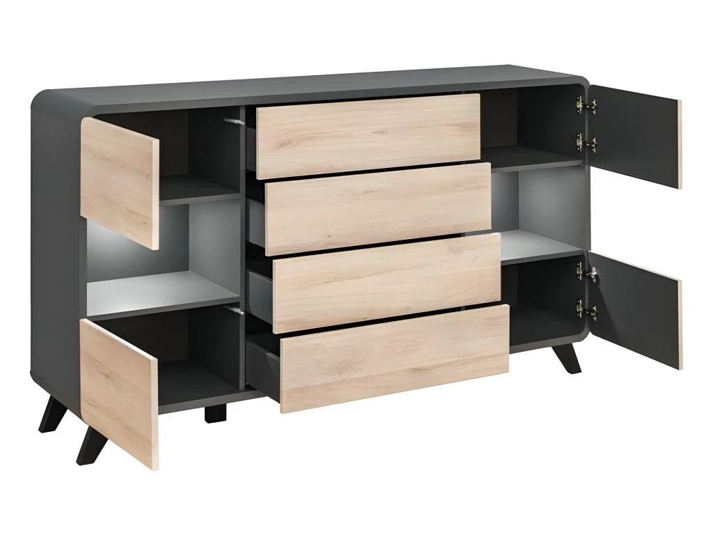 – CARACTÉRISTIQUES : Buffet avec 4 portes, 4 tiroirs et 2 niches. Présence du système « push to open » sur les portes. Niches éclairées par des LED. Angles arrondis et pieds design