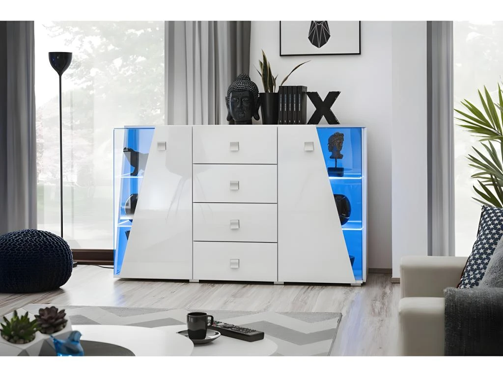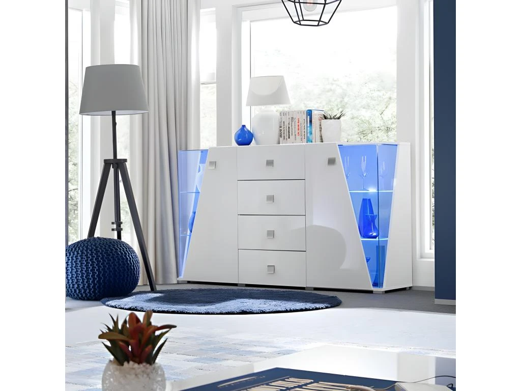 – CARACTÉRISTIQUES : Buffet avec 4 tiroirs et 2 portes. Portes partiellement vitrées avec éclairage LED. Étagère en verre derrière les portes.