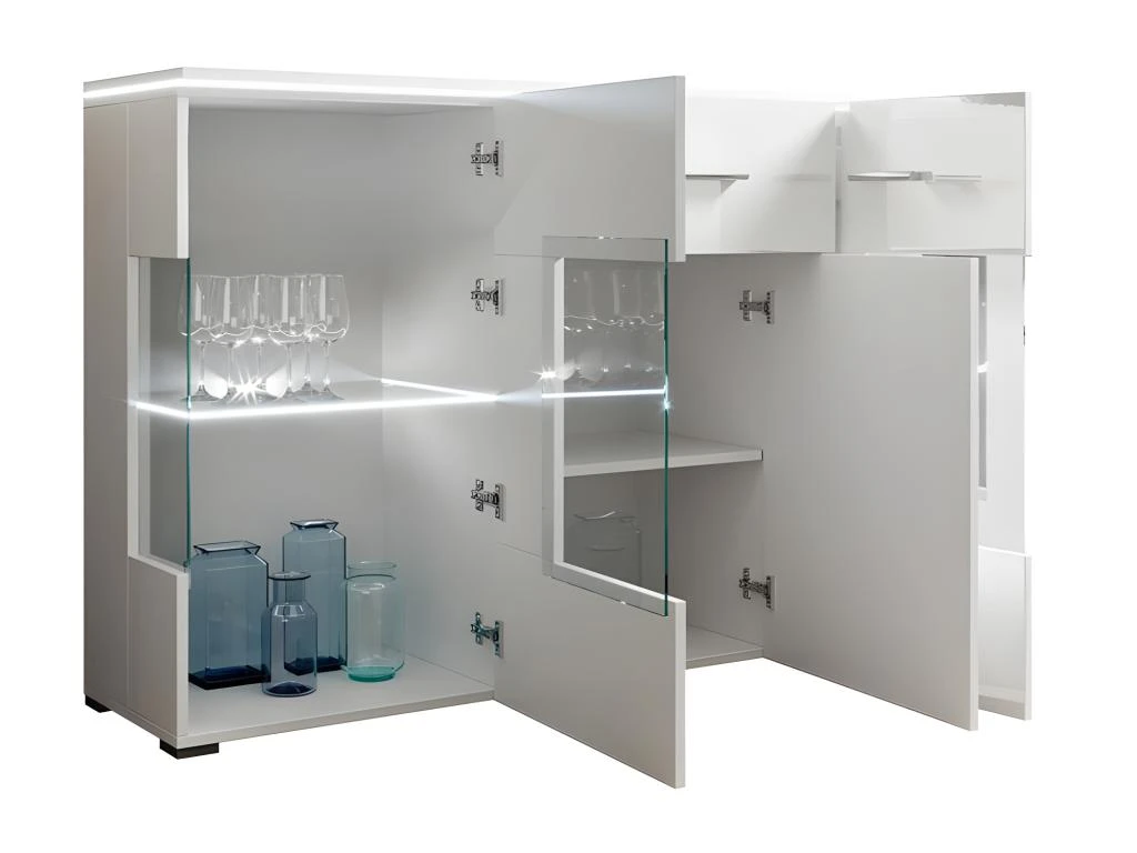 – COMPOSITION : Buffet KIELS 150cm. (2 portes avec une partie vitrée et éclairage LED intégré. 1 porte pleine et un tiroir. )