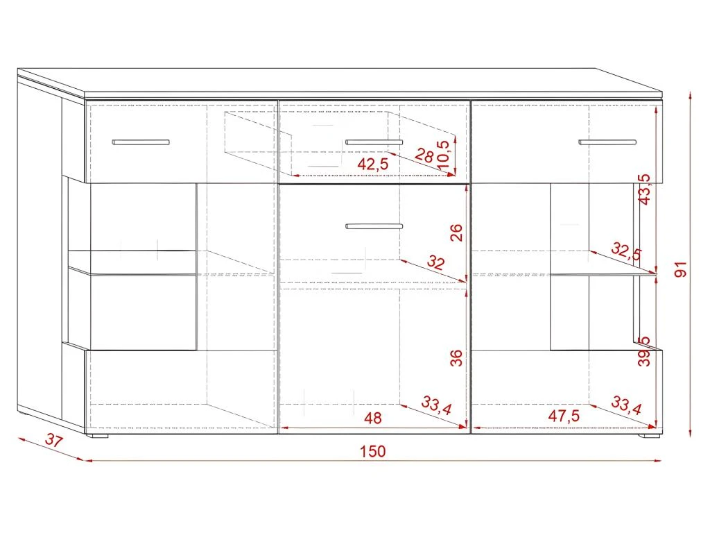 – DIMENSIONS : L 150 x H 91 x P 37cm.