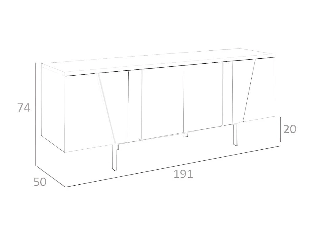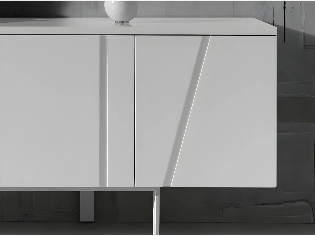 Buffet avec un design moderne et des lignes simples avec une structure en MDF laqué en blanc brillant RAL9003, des pieds et des détails de façade d’origine en acier inoxydable chromé 22 microns peint en blanc. Créez une atmosphère unique et différente avec ce buffet, et il procure une sensation d’espace et de lumière, tout en gardant tout en ordre grâce à sa grande capacité de rangement grâce à ses quatre portes pliantes et sa tablette intérieure assortie en bois DM laqué blanc RAL9003
