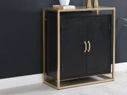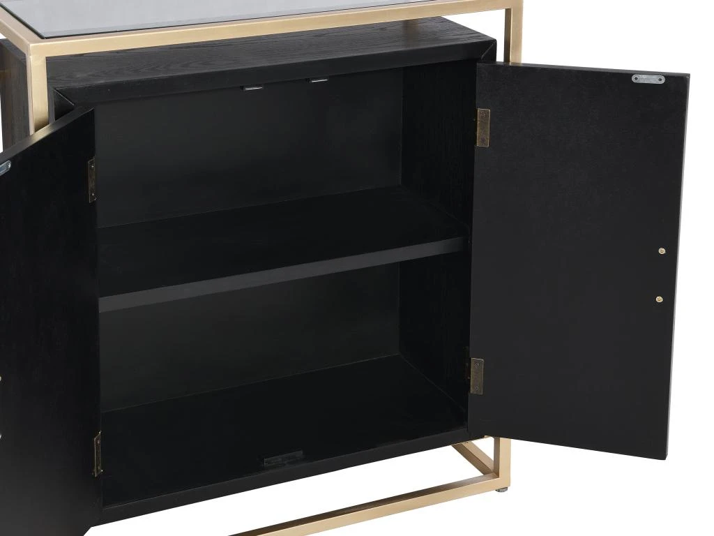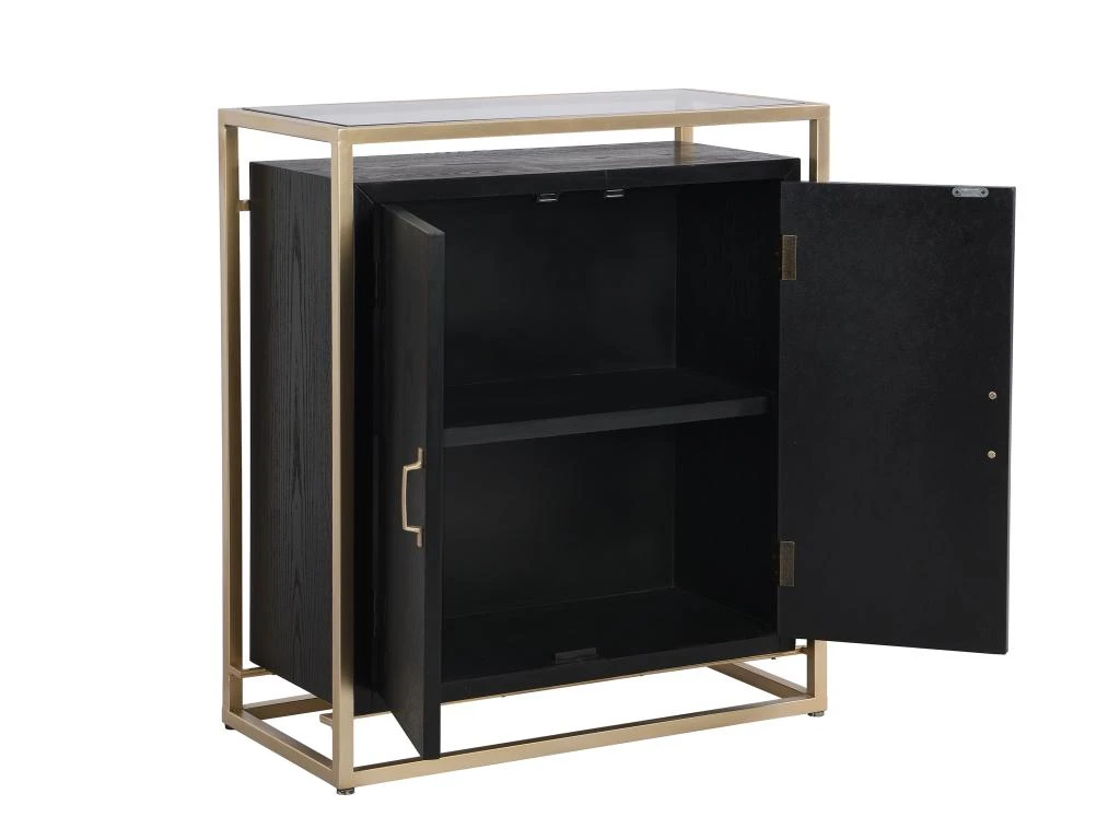 TERIAVI est un buffet haut à la forme originale. Son espace de rangement au coloris sombre est placé dans un cadre en métal doré. Au-dessus du meuble vous pourrez déposer des objets décoratifs sur un plateau en verre trempé.