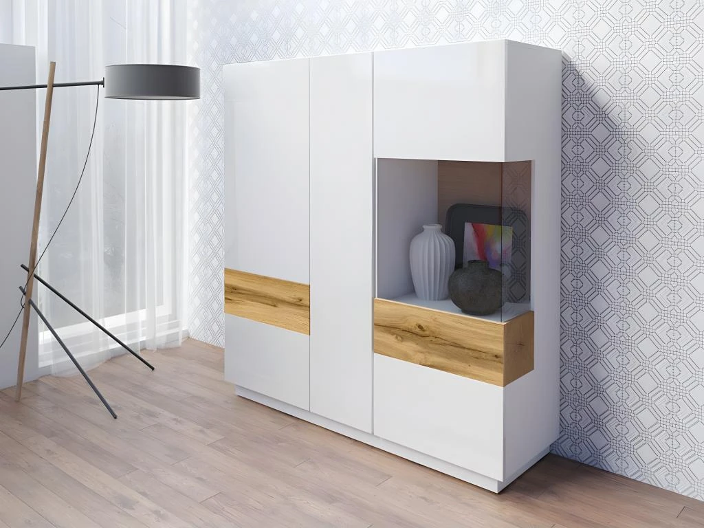 Offrez à votre salon un style unique au top des dernières tendances déco grâce à ce buffet haut de la gamme KILES ! Ce buffet est composé de nombreux rangements grâce à ses trois portes. Mettez en valeur vos objets décoratifs grâce à sa porte en partie vitrée et son éclairage LED intégré.