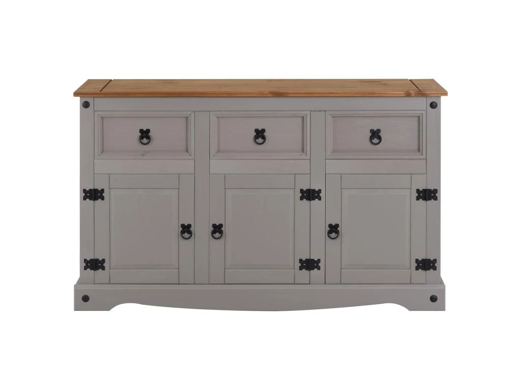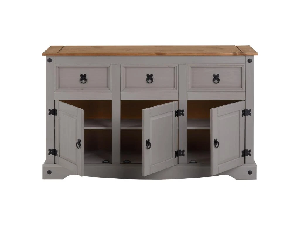 – Le buffet est fabriqué en pin massif et lasuré de coloris gris.