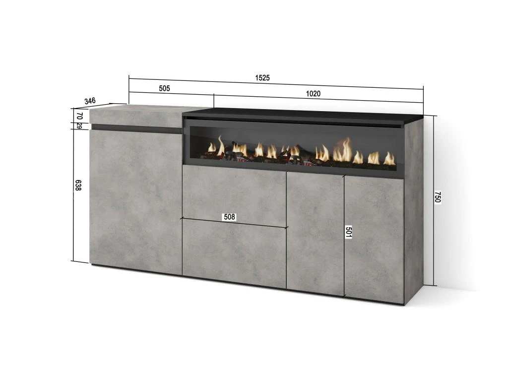 Module latéral de buffet avec porte et étagère de séparation intérieure. Dimensions du module: 51cm. Largeur, 75 cm. Hauteur, 35 cm, profondeur. Couleur ciment et noir avec un veinage du bois poreux au touché de haute qualité.