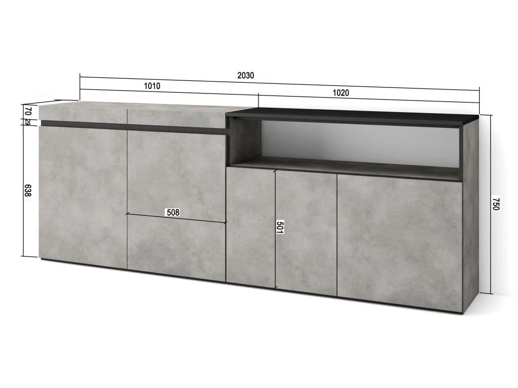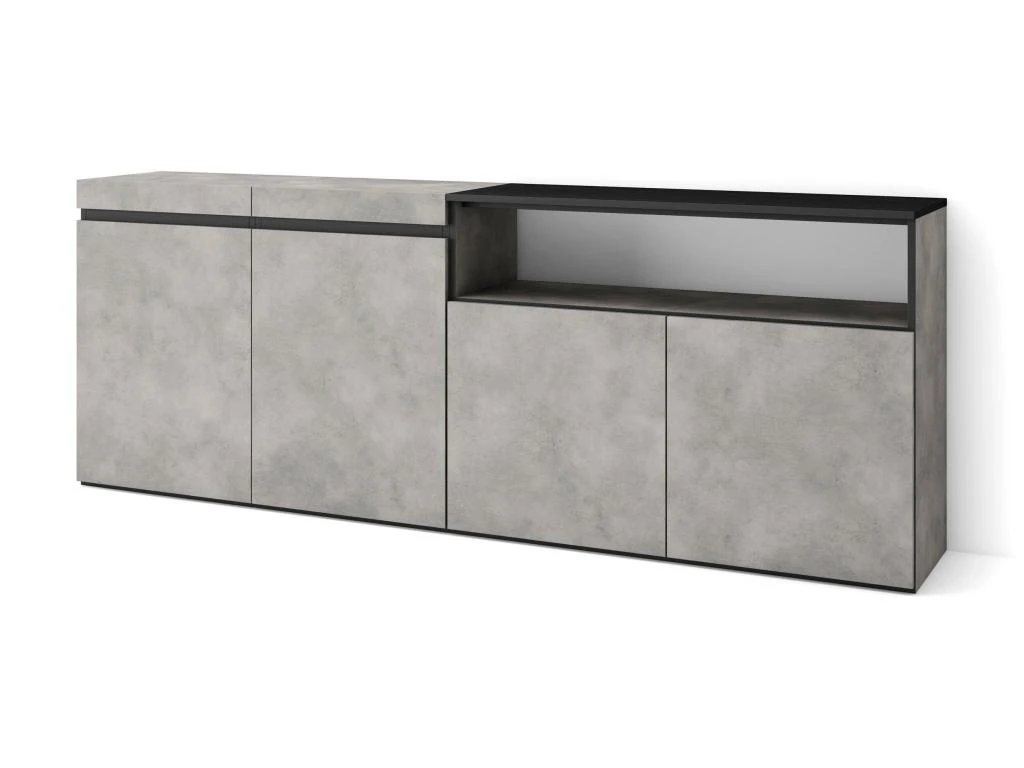 Module latéral de buffet avec porte et étagère de séparation intérieure. Dimensions du module: 51cm. Largeur, 75 cm. Hauteur, 35 cm, profondeur. Couleur ciment et noir avec un veinage du bois poreux au touché de haute qualité.
