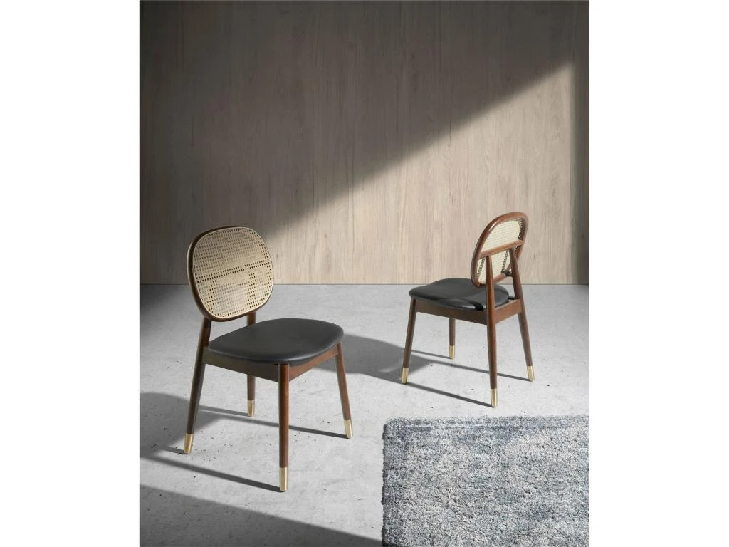 Matière : dossier : filet de rotin, assise : mousse polyester injectée densité 25 kg/m3 recouverte de similicuir (90 % vinyle, 10 % polyester), pieds : bois de frêne massif, détails : acier ,