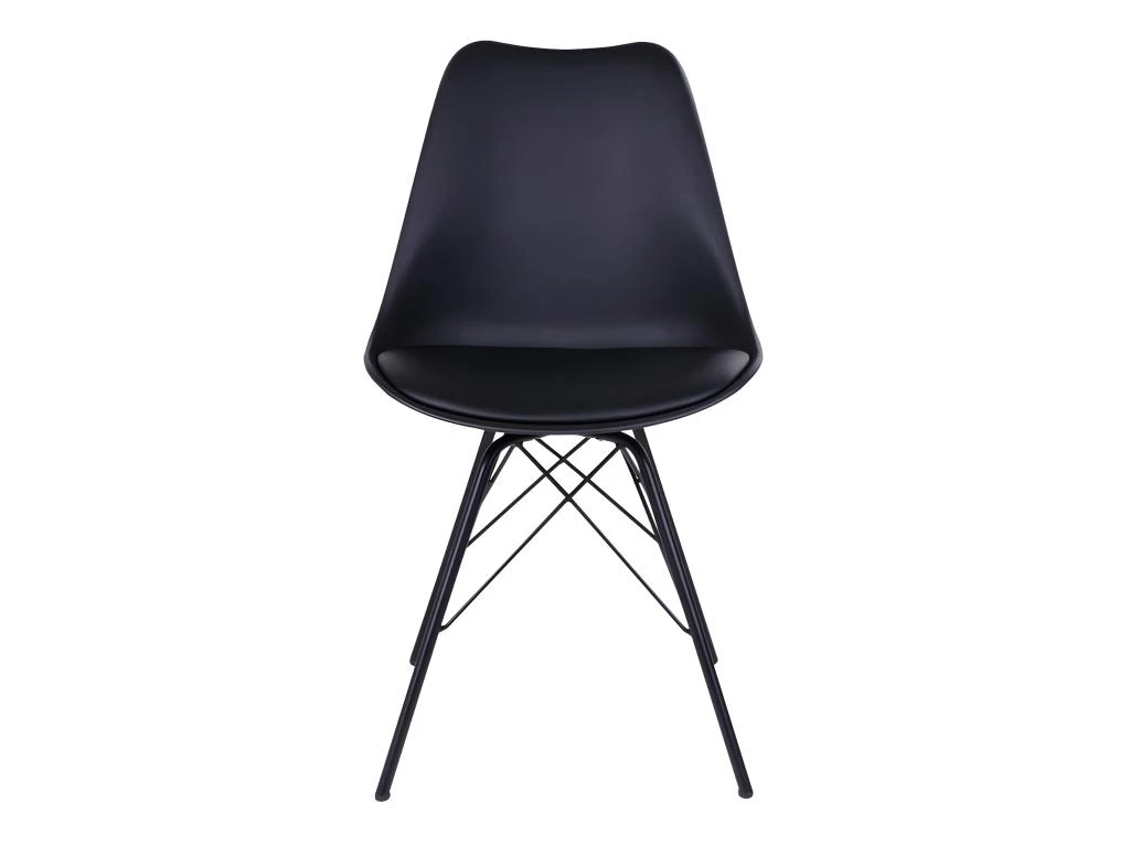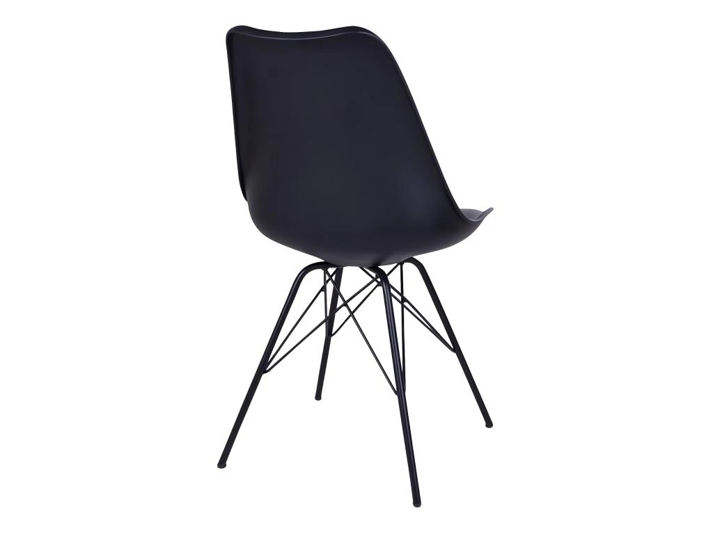 Piétement métallique coloris noir. Coque assise et dossier en plastique coloris noir. Galette Assise en simili cuir coloris noir. Hauteur d’assise : 48 cm. Profondeur d’assise : 42 cm