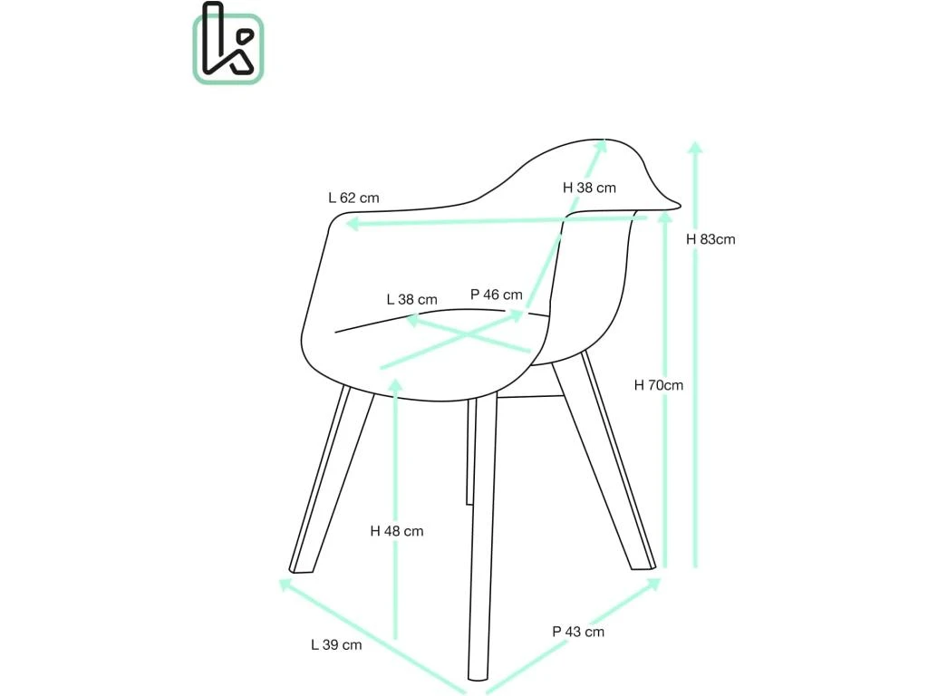 – Assise : 63 (L – Accoudoirs) x 46 (P – Assise) cm
