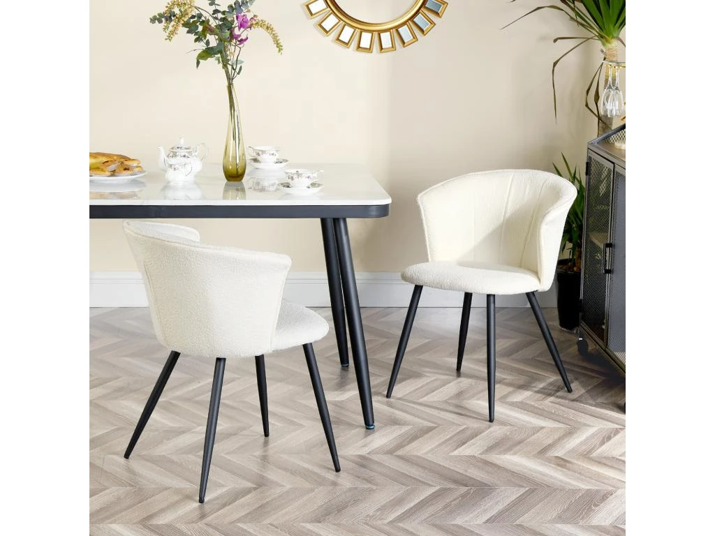 Une chaise venue du froid: la tendance du tissu bouclette arrive des contrées nordiques pour réchauffer nos intérieurs. Dotée de lignes épurées et habillée d’un blanc lumineux, elle invite à des moments conviviaux à partager autour d’une table, à un dîner en amoureux ou un goûter gourmand. Toutefois, son côté chaleureux et cosy l’incite aussi à se frayer un chemin du côté de la chambre à coucher !