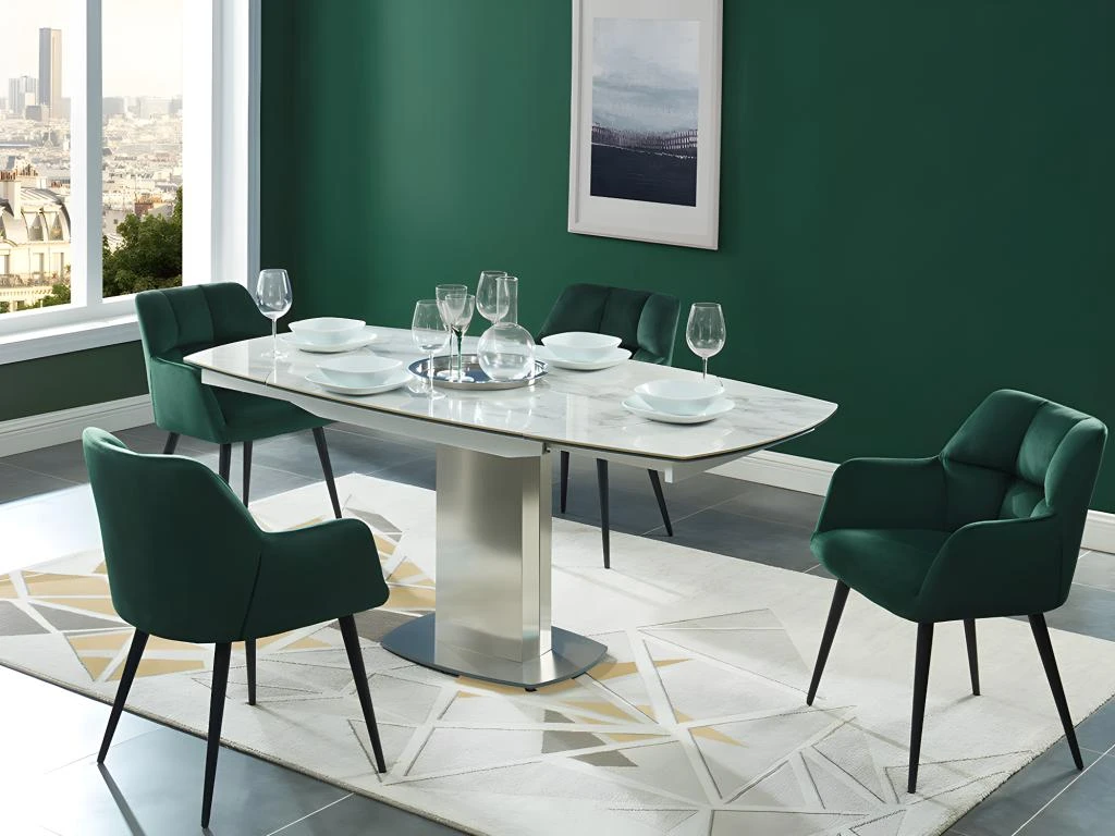 Véritable fauteuil de table grâce à ses accoudoirs rembourés, la chaise PEGA est entièrement recouverte de velours ce qui lui apporte son côté chic et glamour. Enfin, son piétement en métal noir garantie sa stabilité et sa solidité.