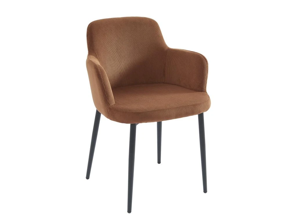 La chaise CELOLA se distingue par son revêtement en velours côtelé, sa forme enveloppante et ses accoudoirs qui vous offriront un confort exquis. Avec son piètement noir, elle s’inscrit parfaitement dans un intérieur contemporain et élégant.