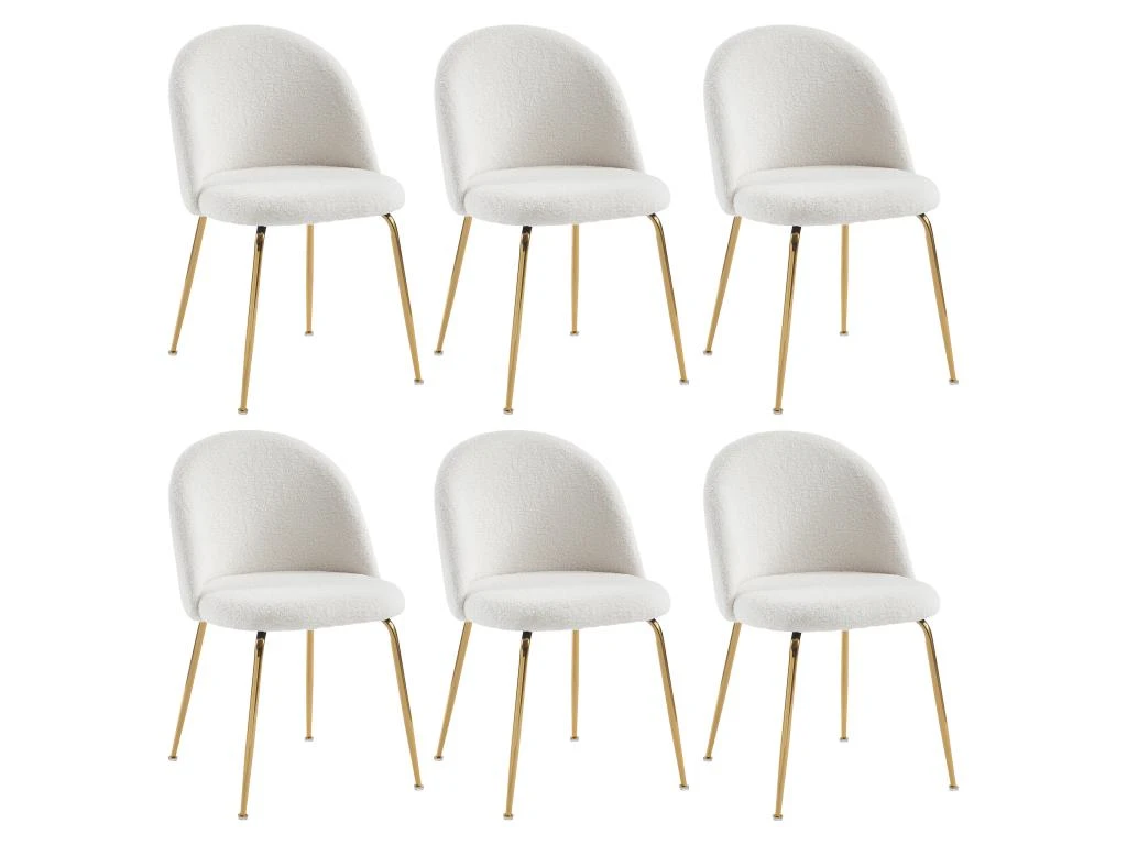 Au coeur de la tendance, la chaise MELBOURNE vous hypnotisera par son style aux allures vintage ! Avec son revêtement en tissu bouclette et ses pieds en métal doré, ces chaises se distinguent par leur design raffiné, idéal pour apporter du cachet à votre intérieur.