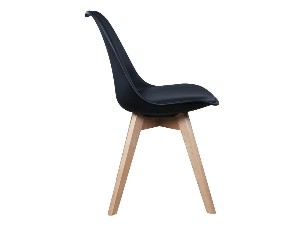 Piétement en bois massif naturel. Coque en poluéthylène coloris noir. Assise dotée d’un rembourrage en simili cuir coloris noir. Hauteur d’assise : 44 cm.