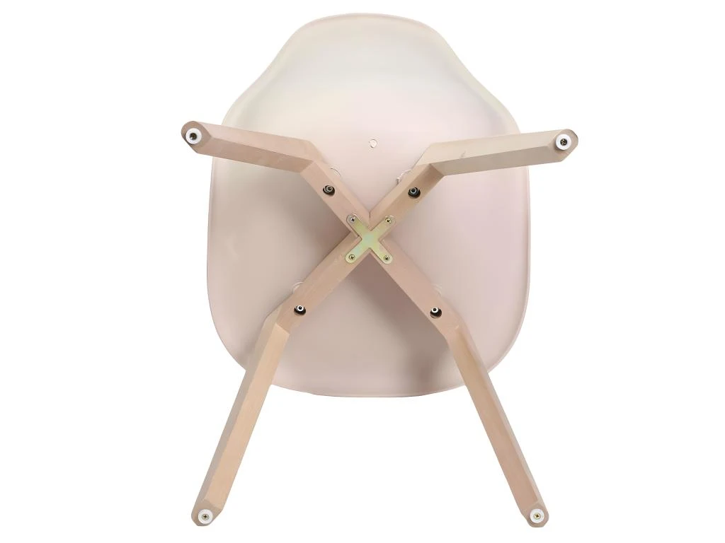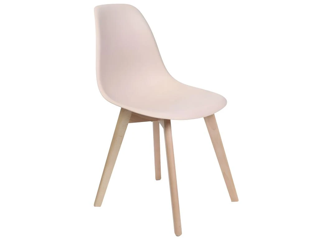 Piétement en bois massif naturel. Coque en poluéthylène coloris rose. Hauteur d’assise : 42 cm.