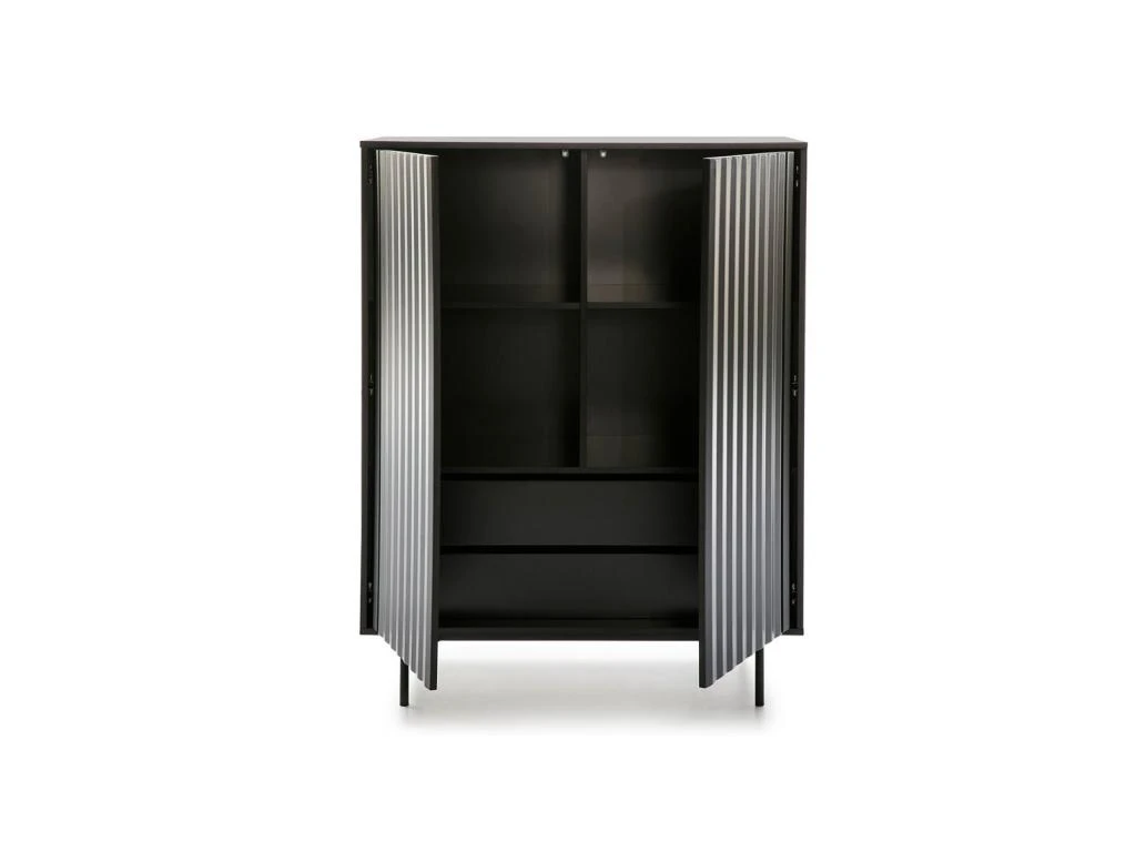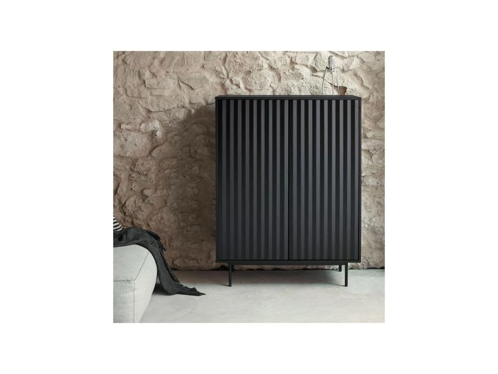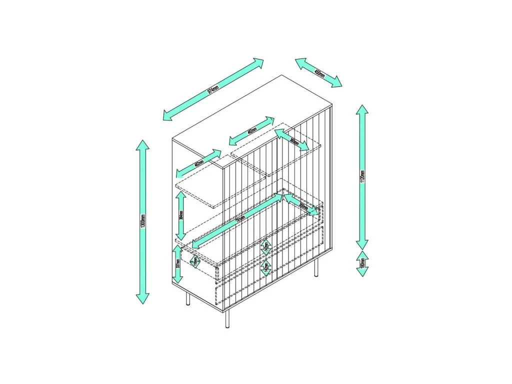 Le piétement minimaliste en métal de ce meuble de rangement design supporte efficacement un corps pourvu de 2 portes au dessin graphique. Vous pourrez ranger un grand nombre d’objet à l’intérieur de ce meuble pourvu de 2 tiroirs intérieurs et de multiples surfaces de pose.