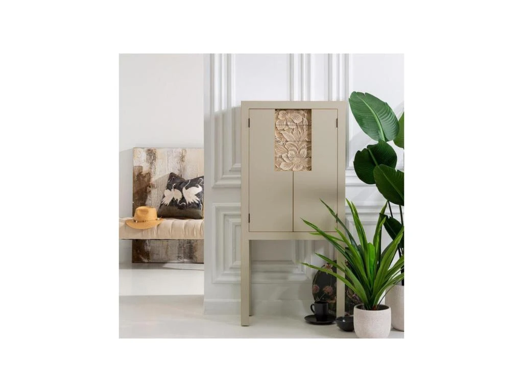 Apte à prendre place au sein d’un ameublement éclectique ce meuble de complément propose un mélange du code esthétique des meubles chinois, un design minimaliste et des sculptures inspirées des meubles ethniques.