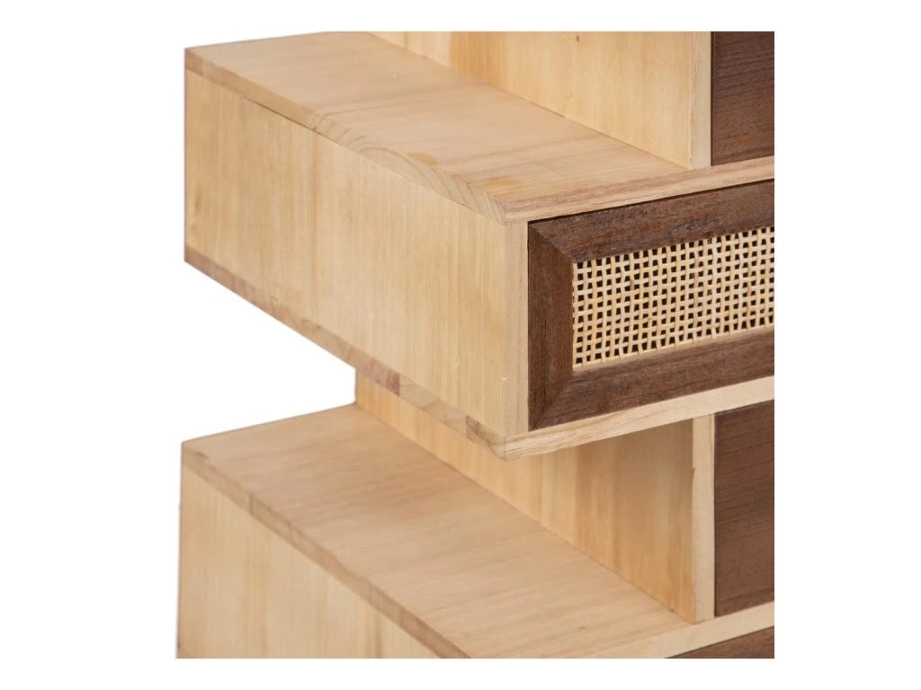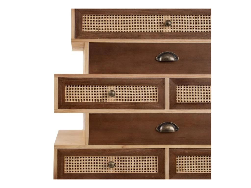 Toute la chaleur du bois est ici soulignée par des façades de tiroir en cannage tressé, ces tiroirs sont mis en relief par des poignées fantaisie issues de meubles de métiers.