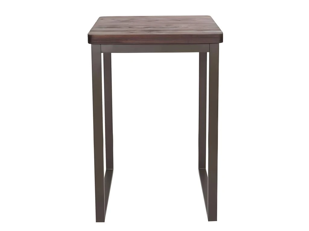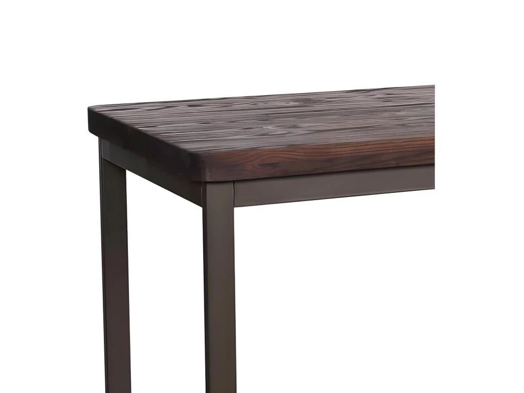 Plateau en bois d’Orme massif foncé, aspect brut, et piètement en acier gris.