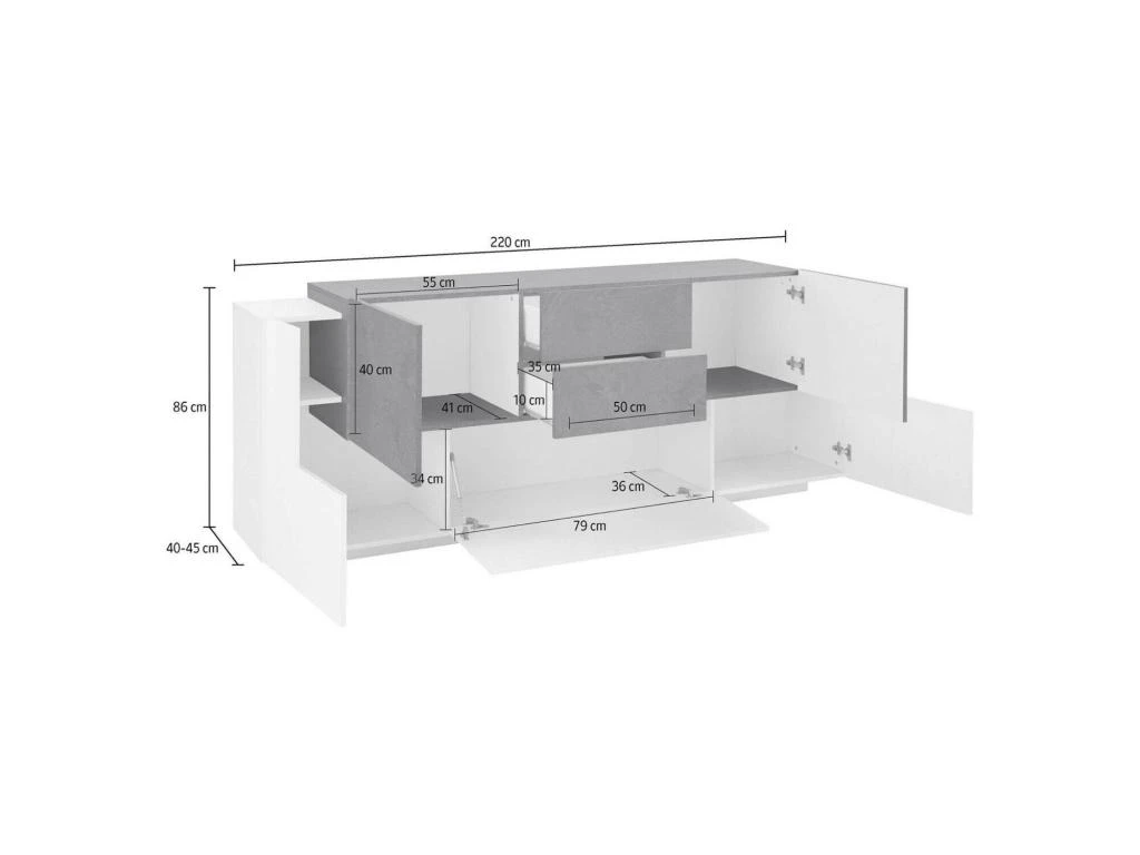 STRUCTURE ET UTILISATION – Buffet de salon pratique et peu encombrant structuré avec quatre portes battantes de différentes tailles, une porte à rabat et deux tiroirs dans la partie centrale, structurés à l’intérieur avec des étagères confortables – Les portes et les tiroirs n’ont pas de poignées, tous deux équipés de charnières solides et guides métalliques – La structure est entièrement en blanc brillant avec des détails Ardoise – L’étagère supérieure est parfaite pour accueillir votre téléviseur ou vos bibelots préférés.