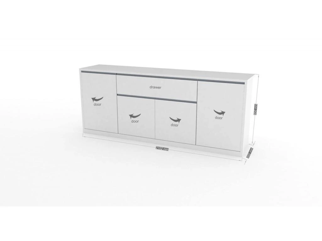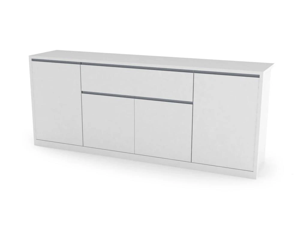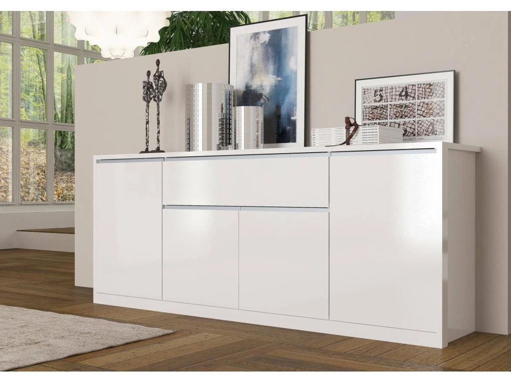 STRUCTURE ET UTILISATION – Buffet de salon pratique et peu encombrant structuré avec quatre portes battantes de différentes tailles, des compartiments internes et un tiroir dans la partie centrale – Les portes et les tiroirs n’ont pas de poignées tous deux équipés de charnières solides et de guides métalliques – La structure est entièrement en couleur blanc brillant – L’étagère supérieure est parfaite pour ranger votre téléviseur ou vos bibelots préférés.