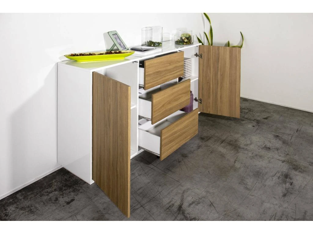 STRUCTURE ET UTILISATION – Meuble de salon pratique et peu encombrant structurĂ© avec trois tiroirs centraux et deux portes battantes, Ă l’intĂ©rieur avec quatre Ă©tagères – Les portes et les tiroirs sont sans poignĂ©es, tous deux Ă©quipĂ©s de charnières solides et de guides mĂ©talliques – L’Ă©tagère supĂ©rieure fait de ce buffet une porte meuble TV oĂą vous pourrez ranger vos bibelots prĂ©fĂ©rĂ©s – Ce meuble est parfait pour dĂ©corer la salle Ă manger, le salon, le couloir, l’entrĂ©e ou le bureau, contenant de la vaisselle, des verres, des nappes, des couverts, des livres, des documents ou des objets de dĂ©coration dans un de manière ordonnĂ©e.