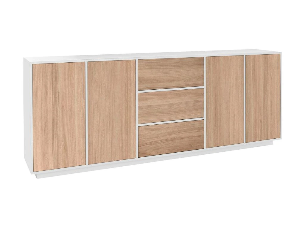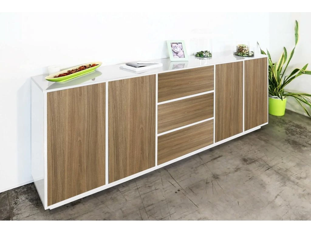 STRUCTURE ET UTILISATION – Meuble de salon pratique et peu encombrant structuré avec trois tiroirs centraux et quatre portes battantes latérales avec huit étagères – Les portes et les tiroirs sont sans poignées tous deux équipés de charnières solides et de glissières métalliques – L’étagère supérieure fait de ce buffet un meuble TV où ranger vos bibelots préférés – Ce meuble est parfait pour décorer la salle à manger, le salon, le couloir, l’entrée ou le bureau, contenant de la vaisselle, des verres, des nappes, des couverts, des livres, des documents ou des objets décoratifs de manière ordonnée.