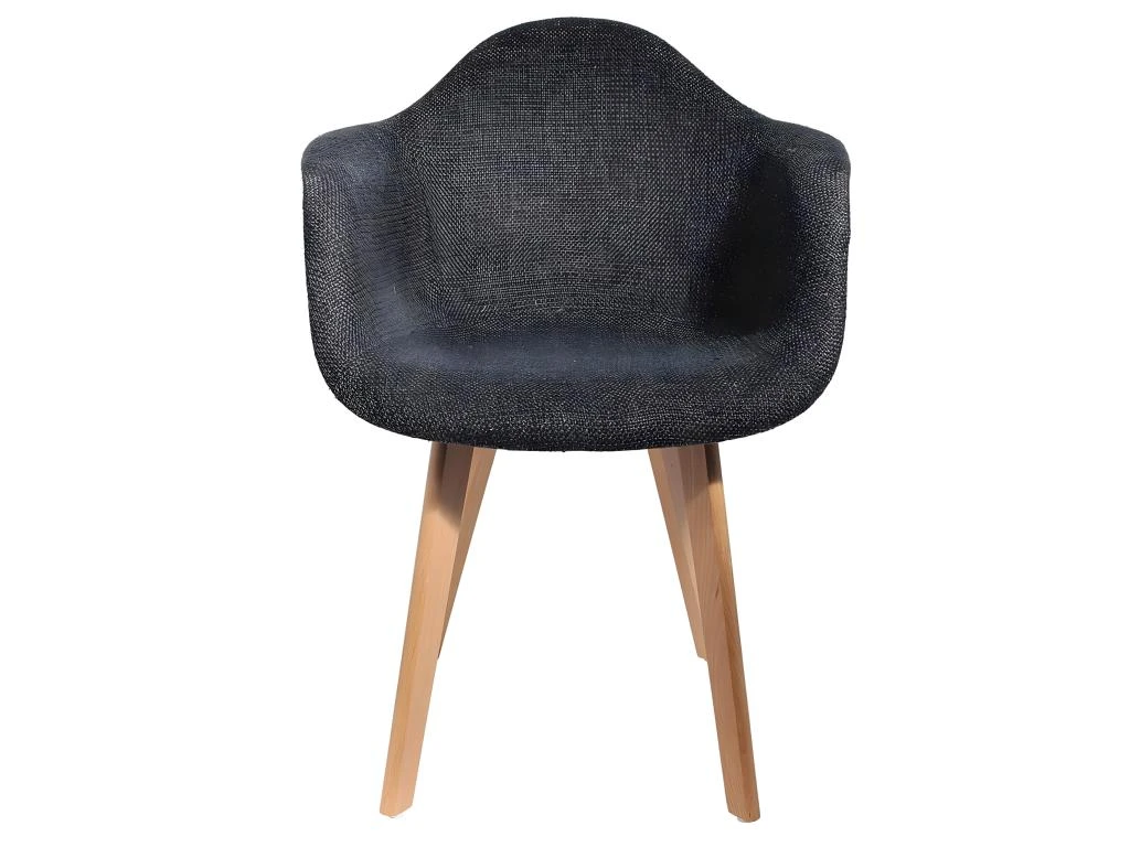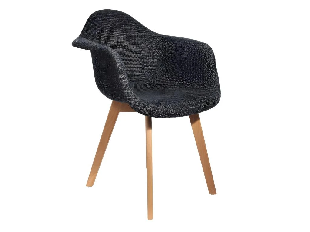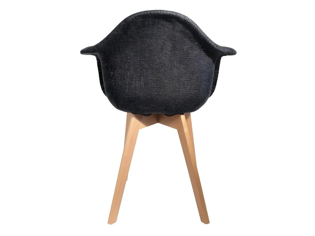 Piétement en hêtre massif, coloris naturel. Assise et dossier revêtus de tissu synthétique coloris noir à grosses mailles. Hauteur d’assise : 48cm.