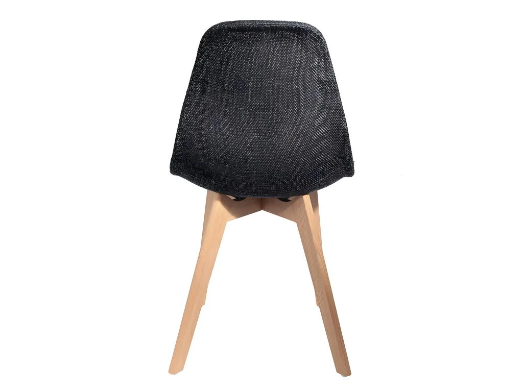 Piétement en hêtre massif, coloris naturel. Assise et dossier revêtus de tissu synthétique coloris noir à grosses mailles. Hauteur d’assise : 49cm.