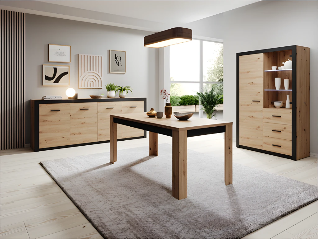 Choisissez une salle à manger contemporaine avec la table à manger 160 cm de la collection Brussel. Son mélange de coloris naturel et noir lui confère un style dans l’air du temps. La table convient pour 6 convives. A monter soi même. Fabrication européenne. . Dimensions : L. 160 x l. 90 x H. 78 cm Poids : 32 kg. Matière : Panneaux de particules agglomérés E1 16mm.