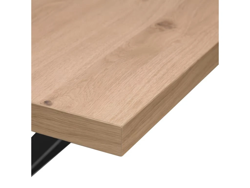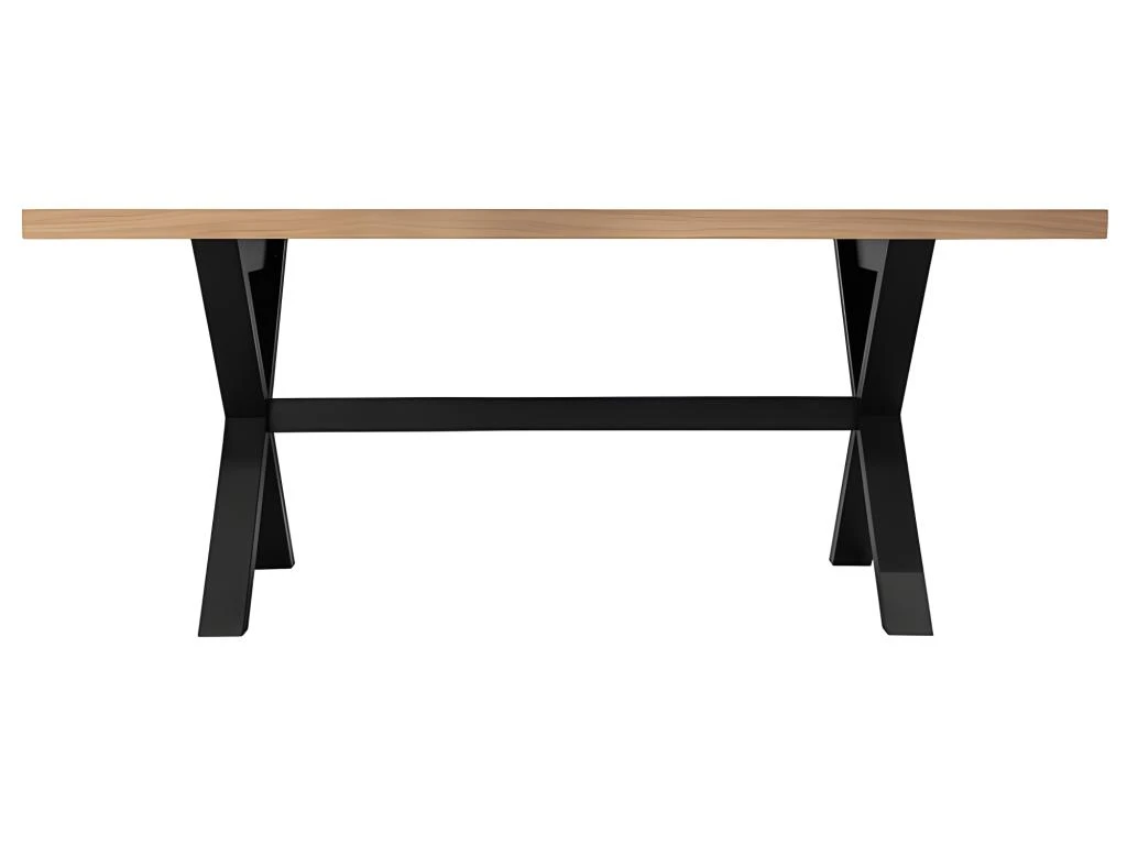 Profitez d’un bon repas autour de cette table de salle à manger 180cm de la marque Atmosphera. Avec ses pieds en croix coloris noir et son plateau avec placage chêne, vous apportez un style contemporain et industriel à votre intérieur. A monter soi même. Dimensions : L180 x l90 x H75 cm. Poids : 49,5 kg. Matière : Panneaux de particules, placage en chêne et pieds en hêtre.